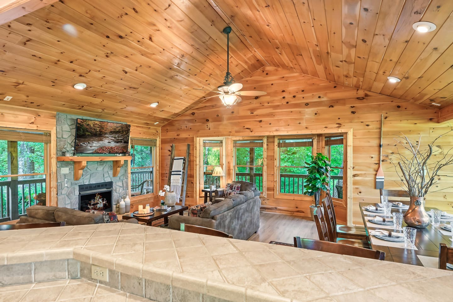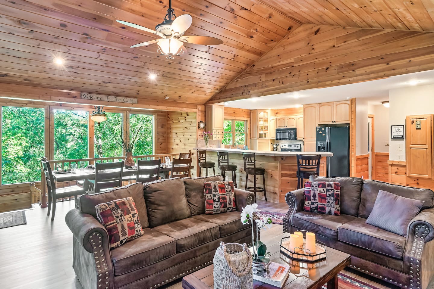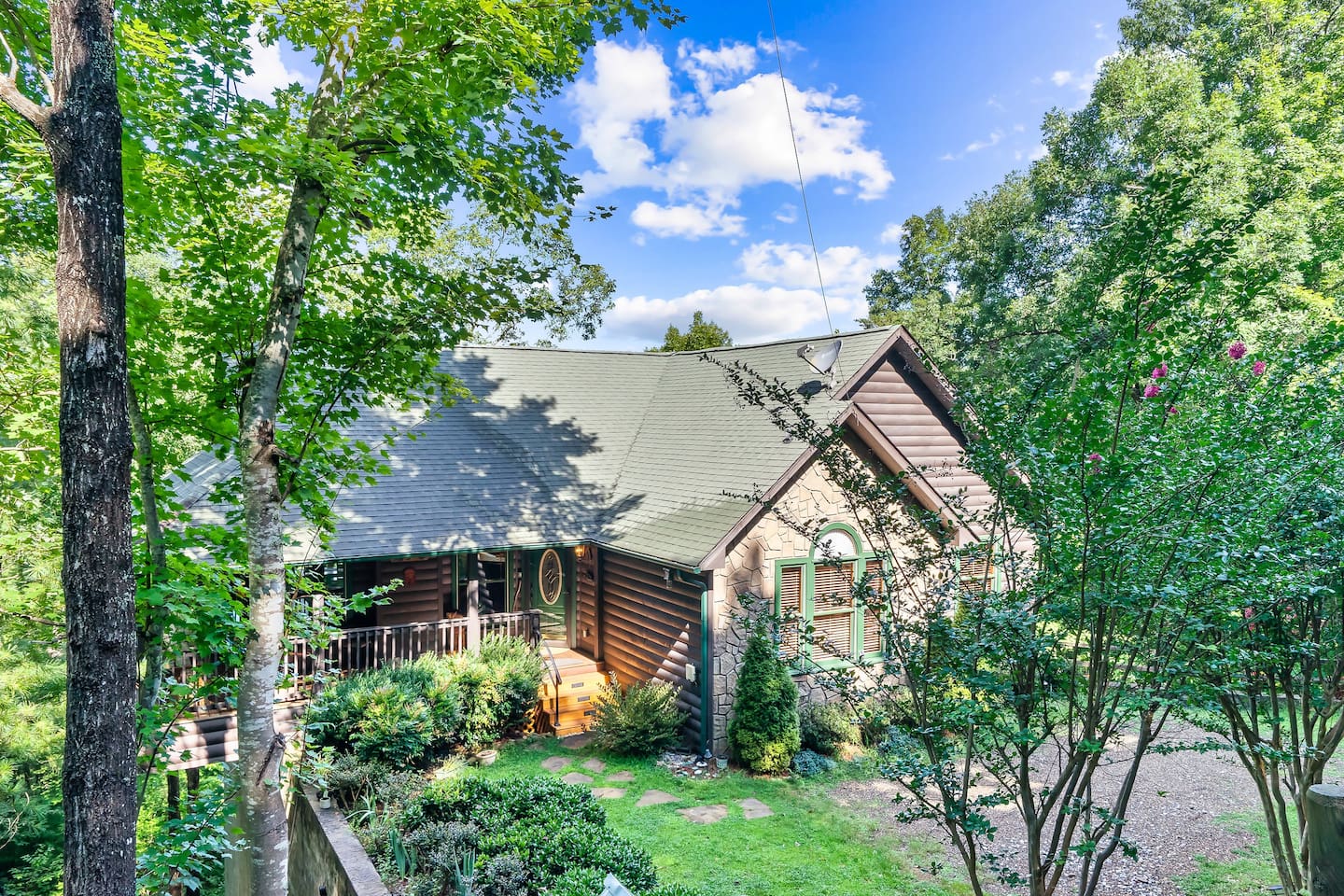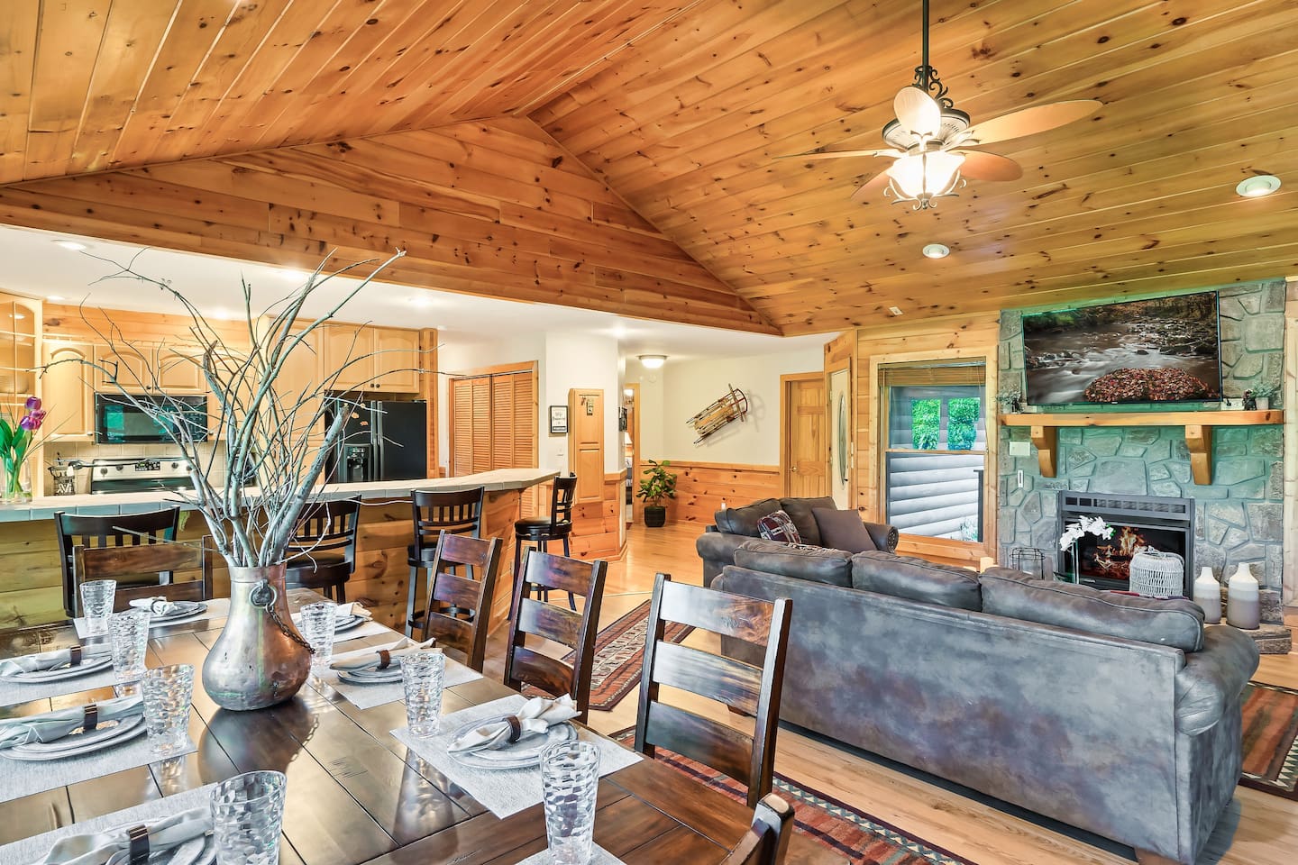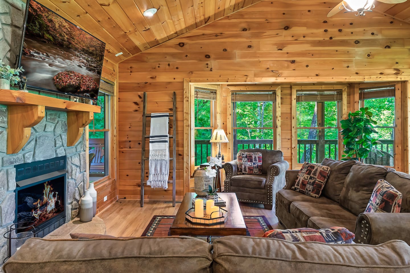 Nestled high among the lush canopy, our cabin offers charm and modern comfort on a gorgeous setting ➤ 4 Bedroom ⎮ 4 Bath ⎮ 2800 ft² ➤ Private hot tub w/ TV ➤ Indoor/outdoor dining ➤ Outdoor movies! ➤ Videogame arcade ➤ Ping Pong ➤ Foosball ➤ Gorgeous covered deck + 180° forest views ➤ Gas grill ➤ Onsite 4 vehicle parking ➤ Gated/guarded community ➤ Onsite washer + dryer ➤ Nearby trails, seasonal pool, sport courts, playground, disc golf, putting green, +more 🚙 15min to the Parkway