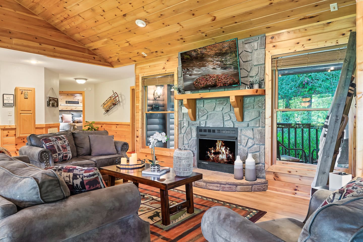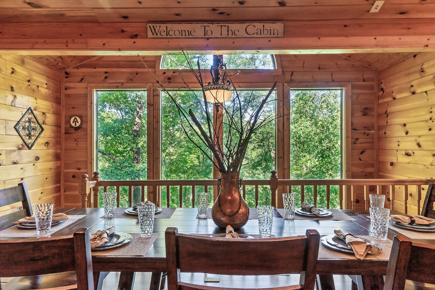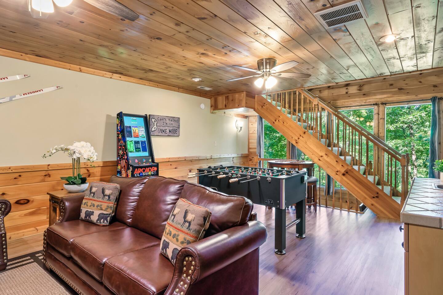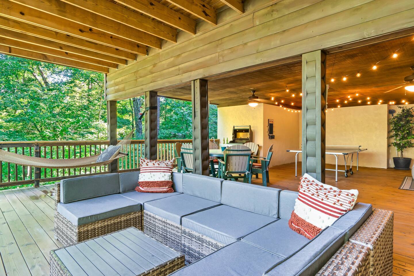 Nestled high among the lush canopy, our cabin offers charm and modern comfort on a gorgeous setting ➤ 4 Bedroom ⎮ 4 Bath ⎮ 2800 ft² ➤ Private hot tub w/ TV ➤ Indoor/outdoor dining ➤ Outdoor movies! ➤ Videogame arcade ➤ Ping Pong ➤ Foosball ➤ Gorgeous covered deck + 180° forest views ➤ Gas grill ➤ Onsite 4 vehicle parking ➤ Gated/guarded community ➤ Onsite washer + dryer ➤ Nearby trails, seasonal pool, sport courts, playground, disc golf, putting green, +more 🚙 15min to the Parkway