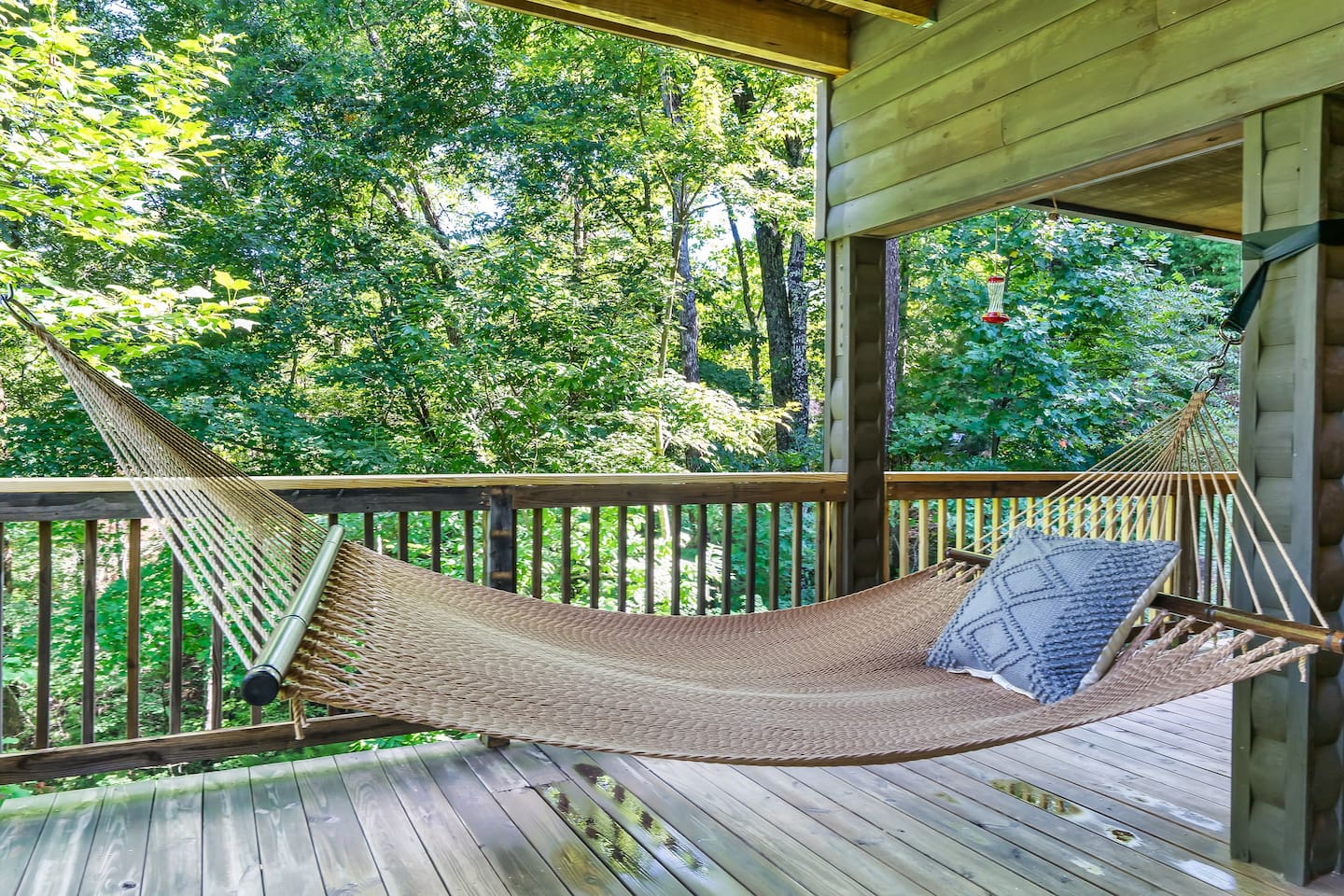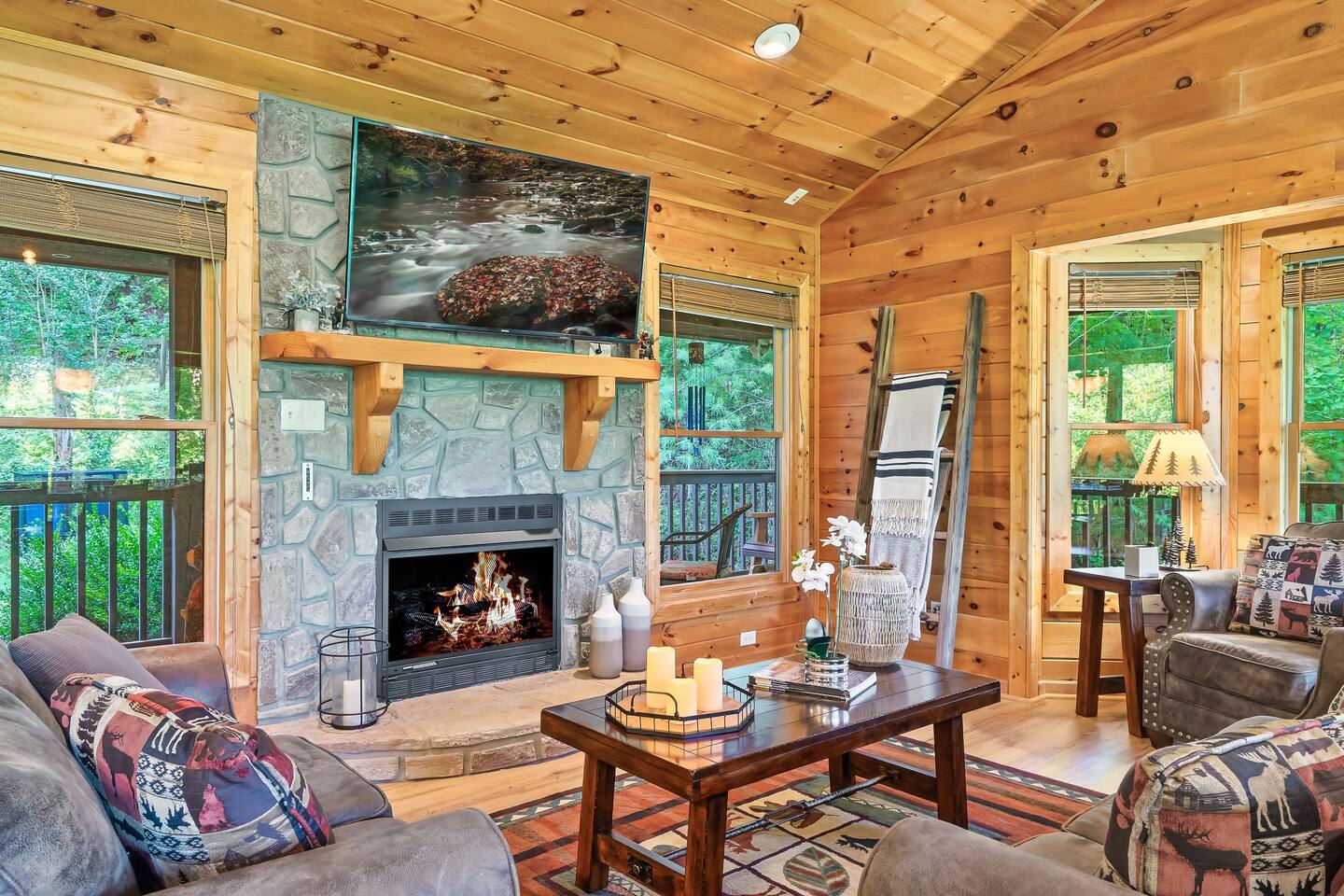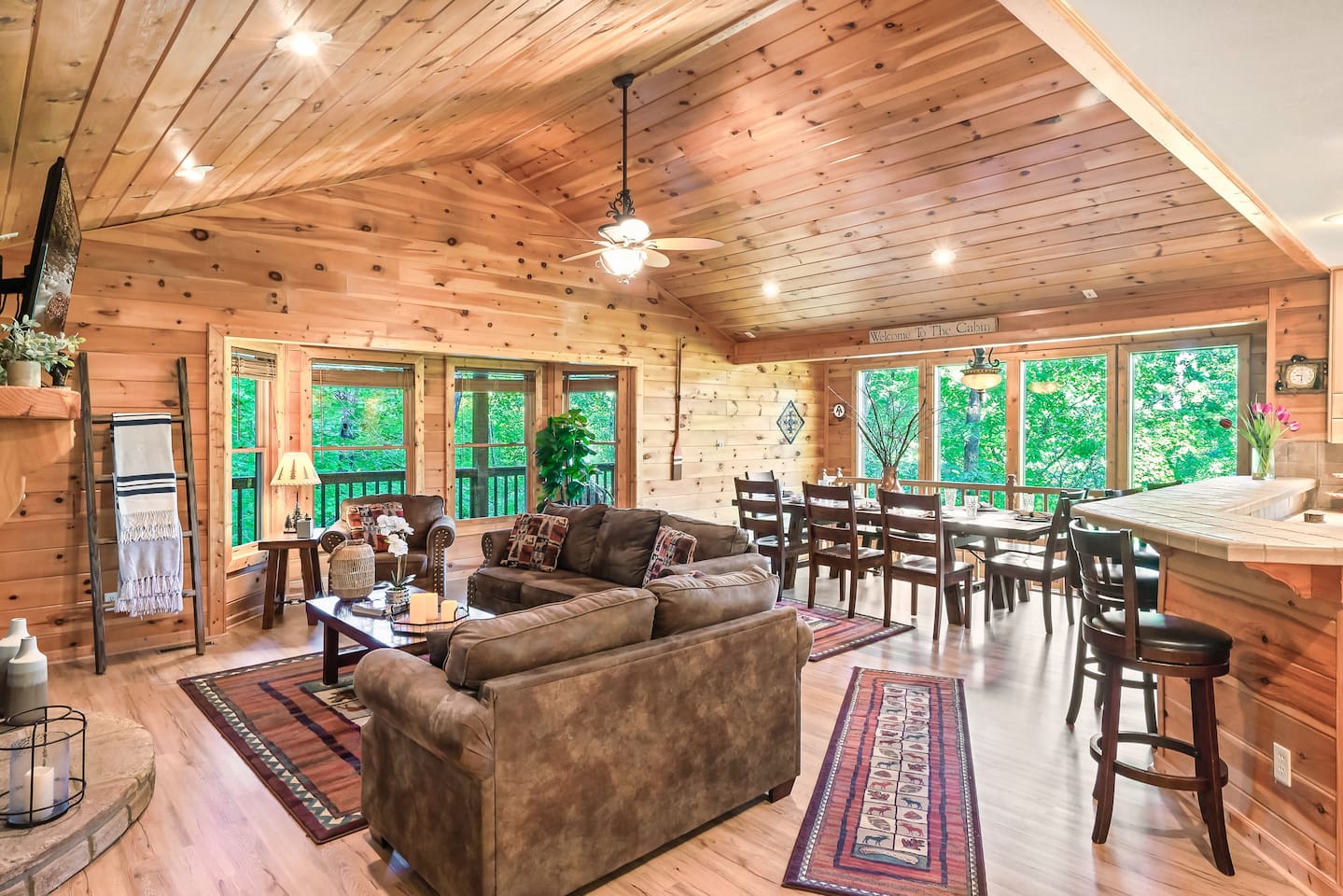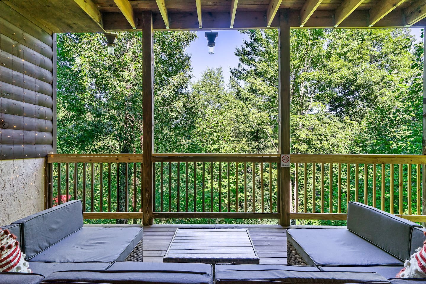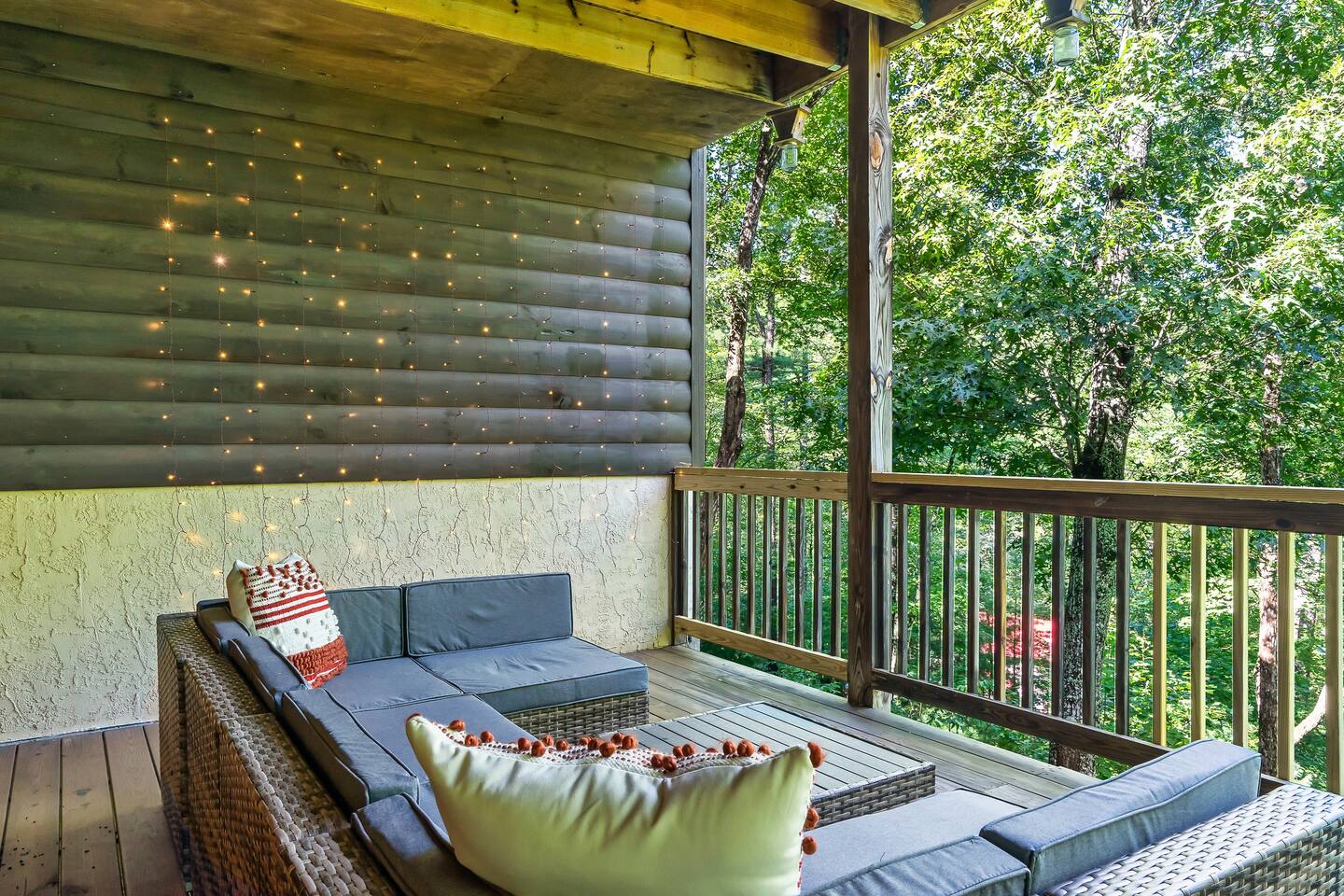 Nestled high among the lush canopy, our cabin offers charm and modern comfort on a gorgeous setting ➤ 4 Bedroom ⎮ 4 Bath ⎮ 2800 ft² ➤ Private hot tub w/ TV ➤ Indoor/outdoor dining ➤ Outdoor movies! ➤ Videogame arcade ➤ Ping Pong ➤ Foosball ➤ Gorgeous covered deck + 180° forest views ➤ Gas grill ➤ Onsite 4 vehicle parking ➤ Gated/guarded community ➤ Onsite washer + dryer ➤ Nearby trails, seasonal pool, sport courts, playground, disc golf, putting green, +more 🚙 15min to the Parkway