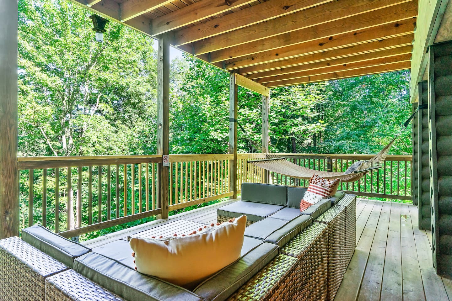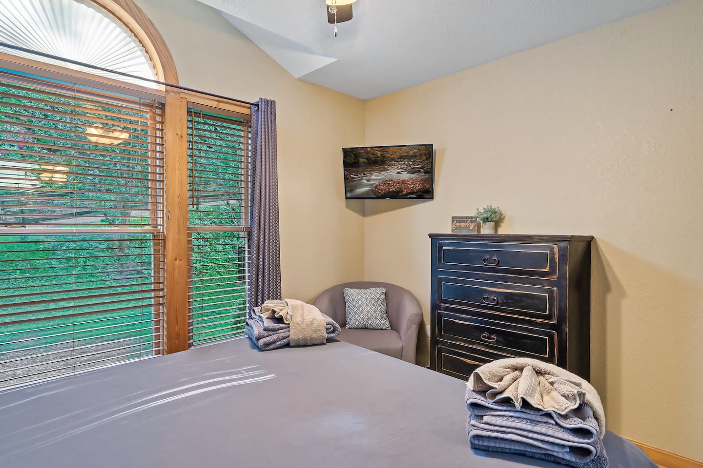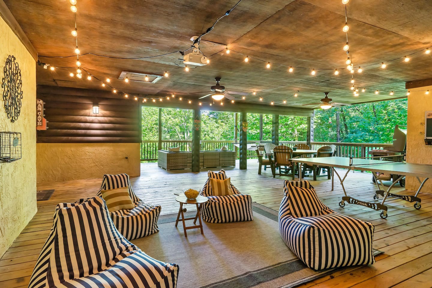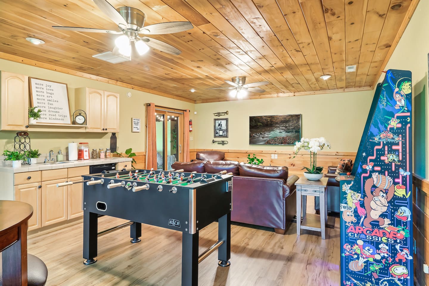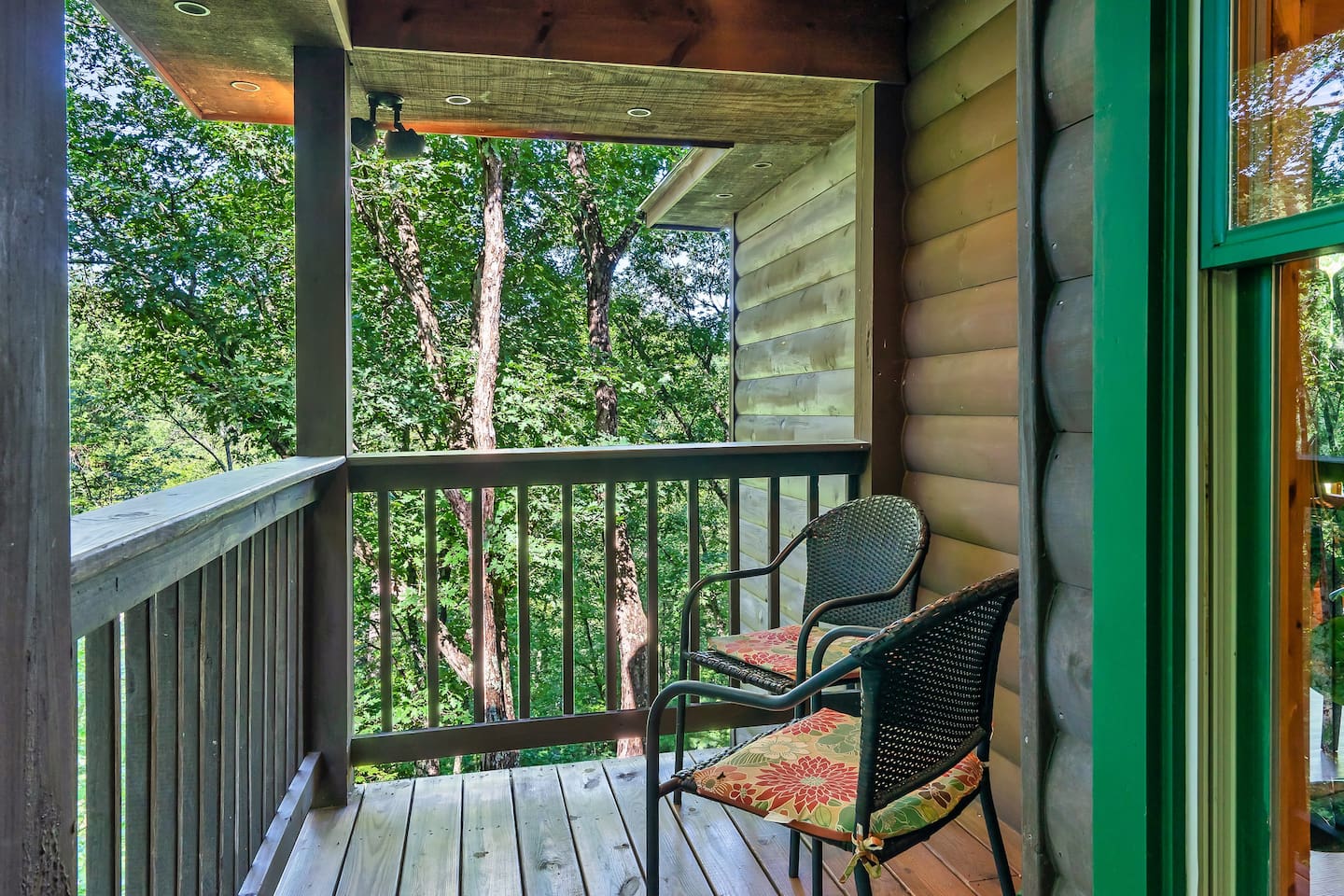 Nestled high among the lush canopy, our cabin offers charm and modern comfort on a gorgeous setting ➤ 4 Bedroom ⎮ 4 Bath ⎮ 2800 ft² ➤ Private hot tub w/ TV ➤ Indoor/outdoor dining ➤ Outdoor movies! ➤ Videogame arcade ➤ Ping Pong ➤ Foosball ➤ Gorgeous covered deck + 180° forest views ➤ Gas grill ➤ Onsite 4 vehicle parking ➤ Gated/guarded community ➤ Onsite washer + dryer ➤ Nearby trails, seasonal pool, sport courts, playground, disc golf, putting green, +more 🚙 15min to the Parkway