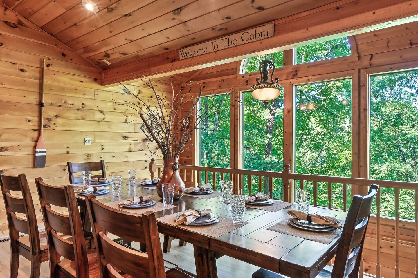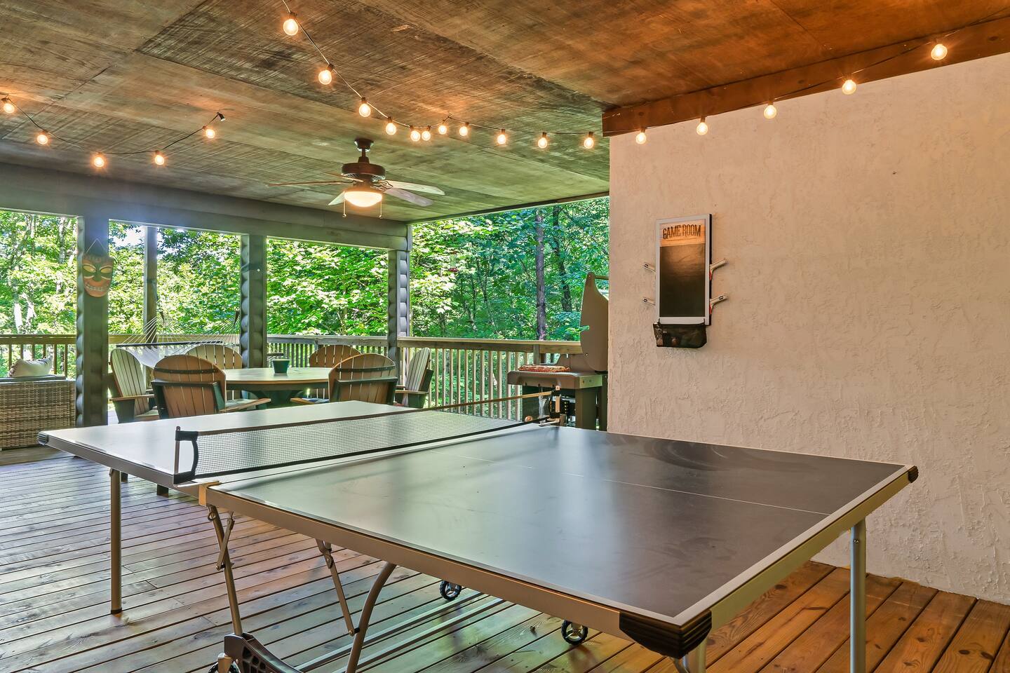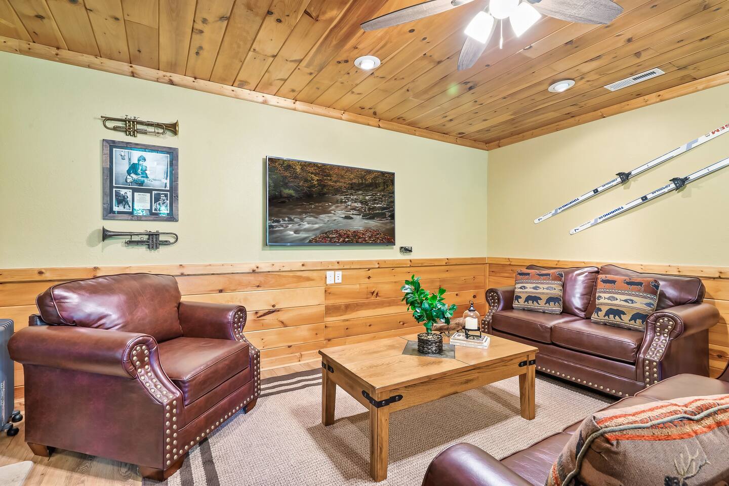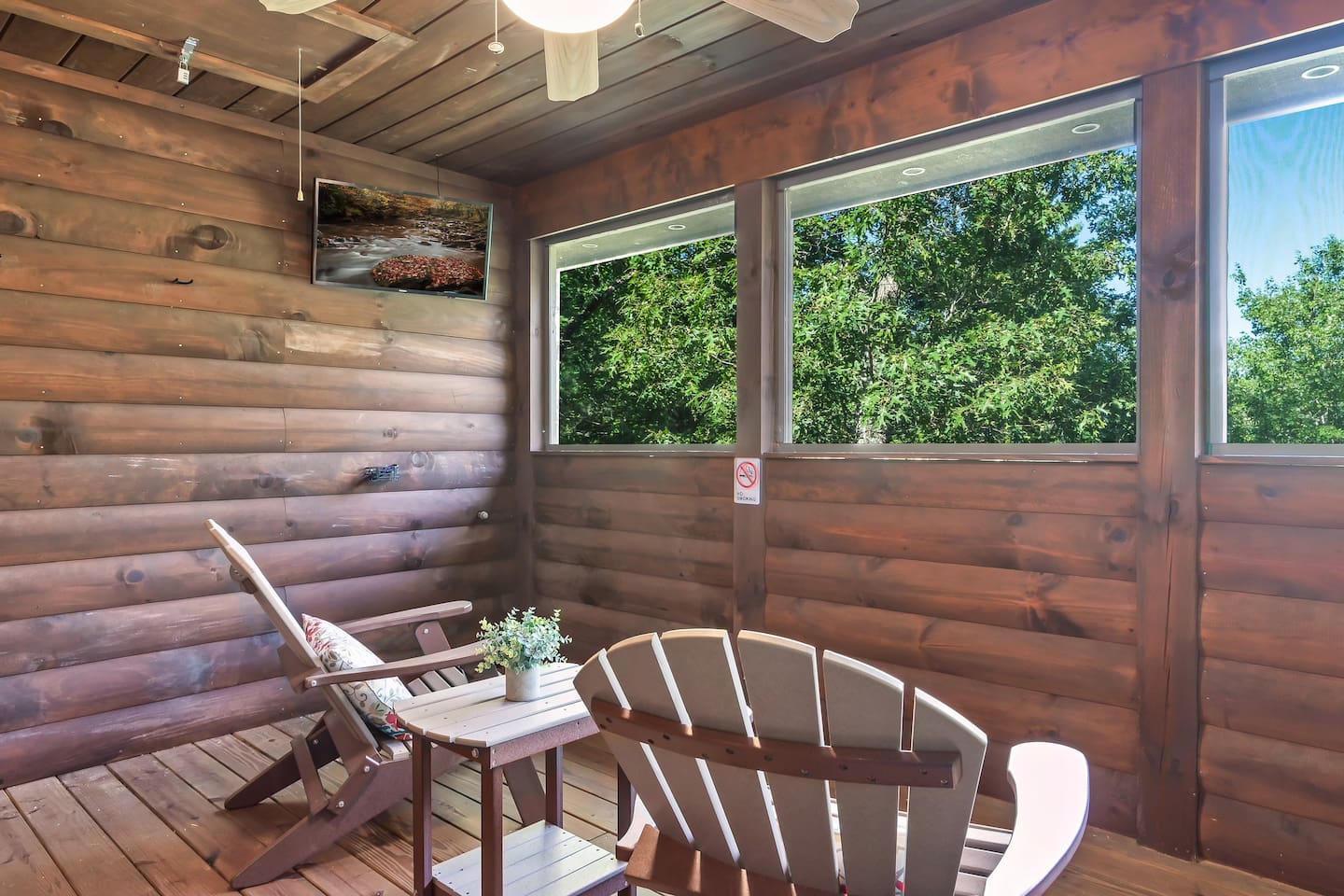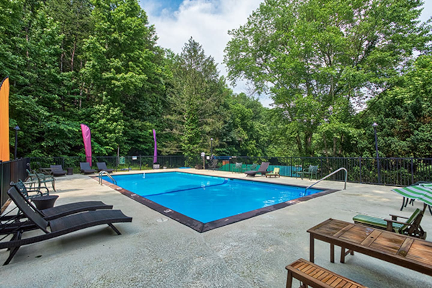 Nestled high among the lush canopy, our cabin offers charm and modern comfort on a gorgeous setting ➤ 4 Bedroom ⎮ 4 Bath ⎮ 2800 ft² ➤ Private hot tub w/ TV ➤ Indoor/outdoor dining ➤ Outdoor movies! ➤ Videogame arcade ➤ Ping Pong ➤ Foosball ➤ Gorgeous covered deck + 180° forest views ➤ Gas grill ➤ Onsite 4 vehicle parking ➤ Gated/guarded community ➤ Onsite washer + dryer ➤ Nearby trails, seasonal pool, sport courts, playground, disc golf, putting green, +more 🚙 15min to the Parkway