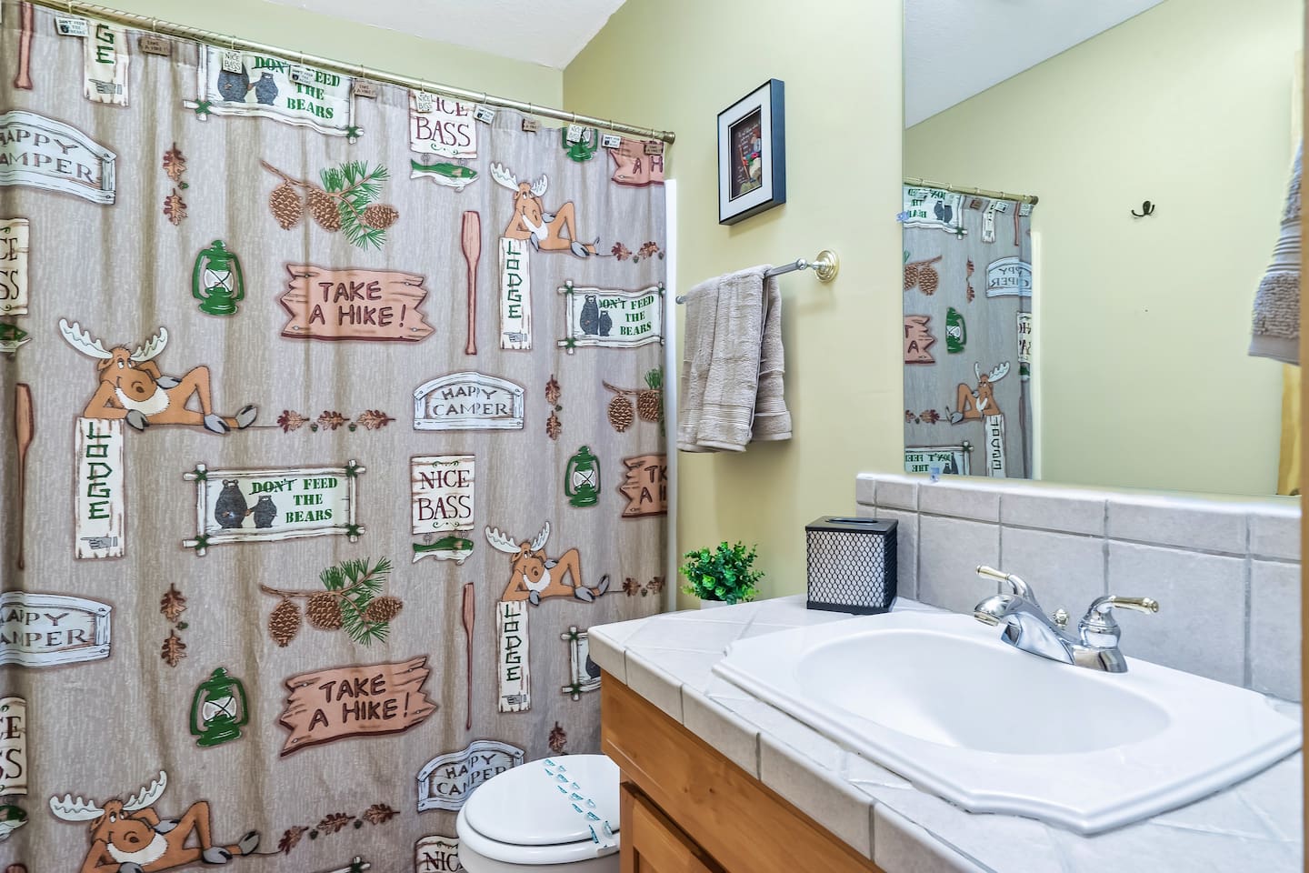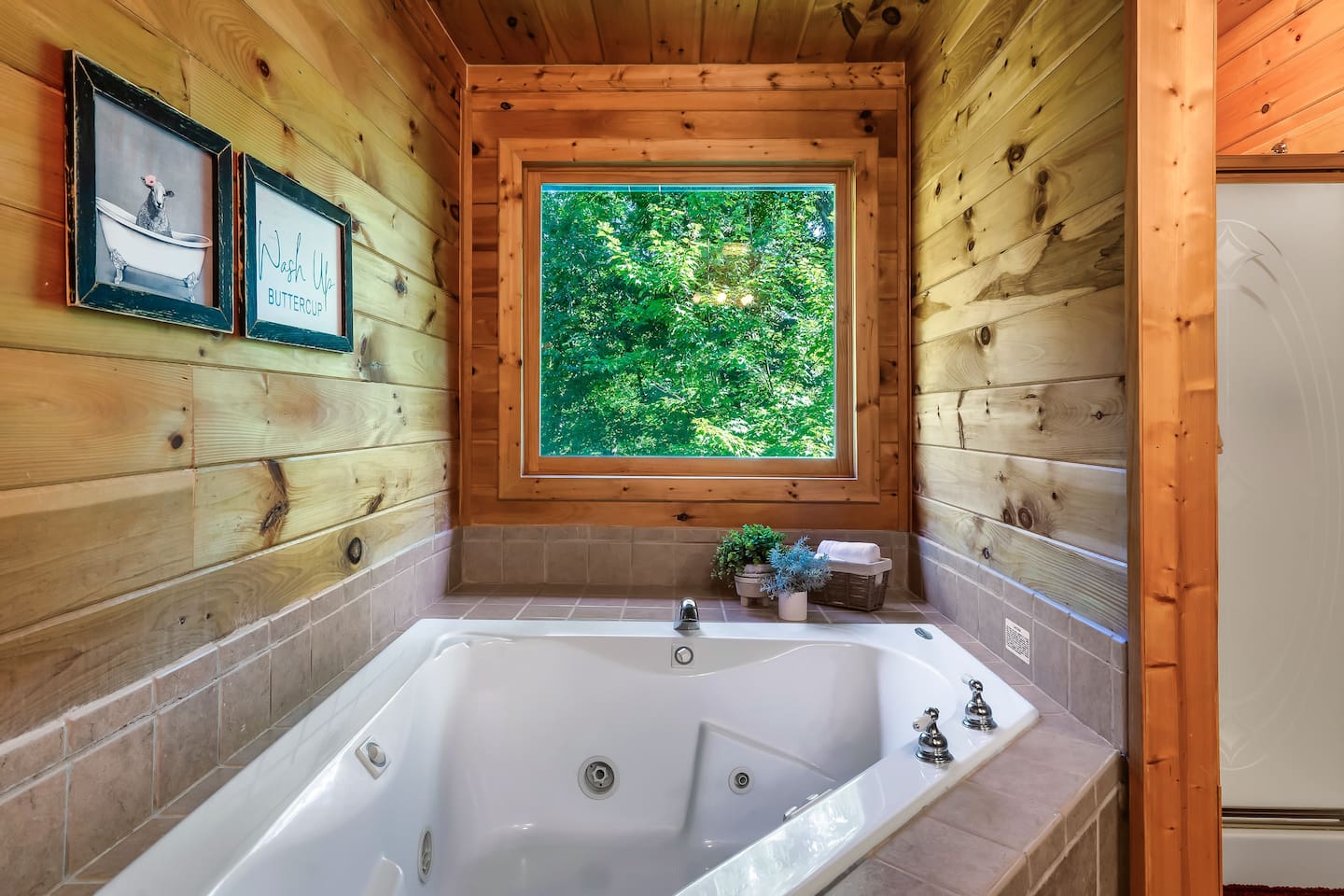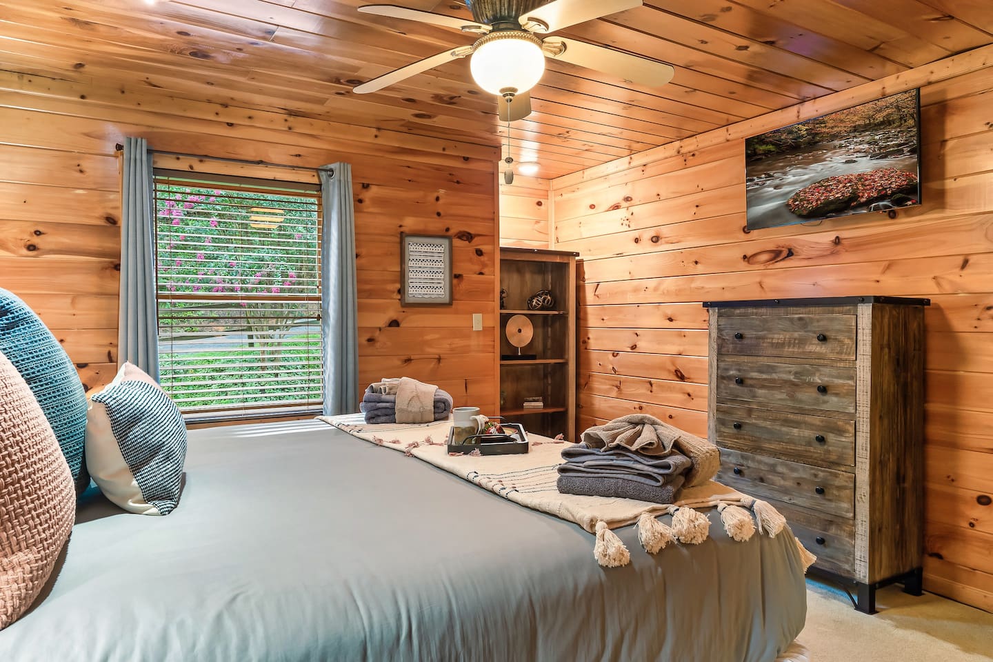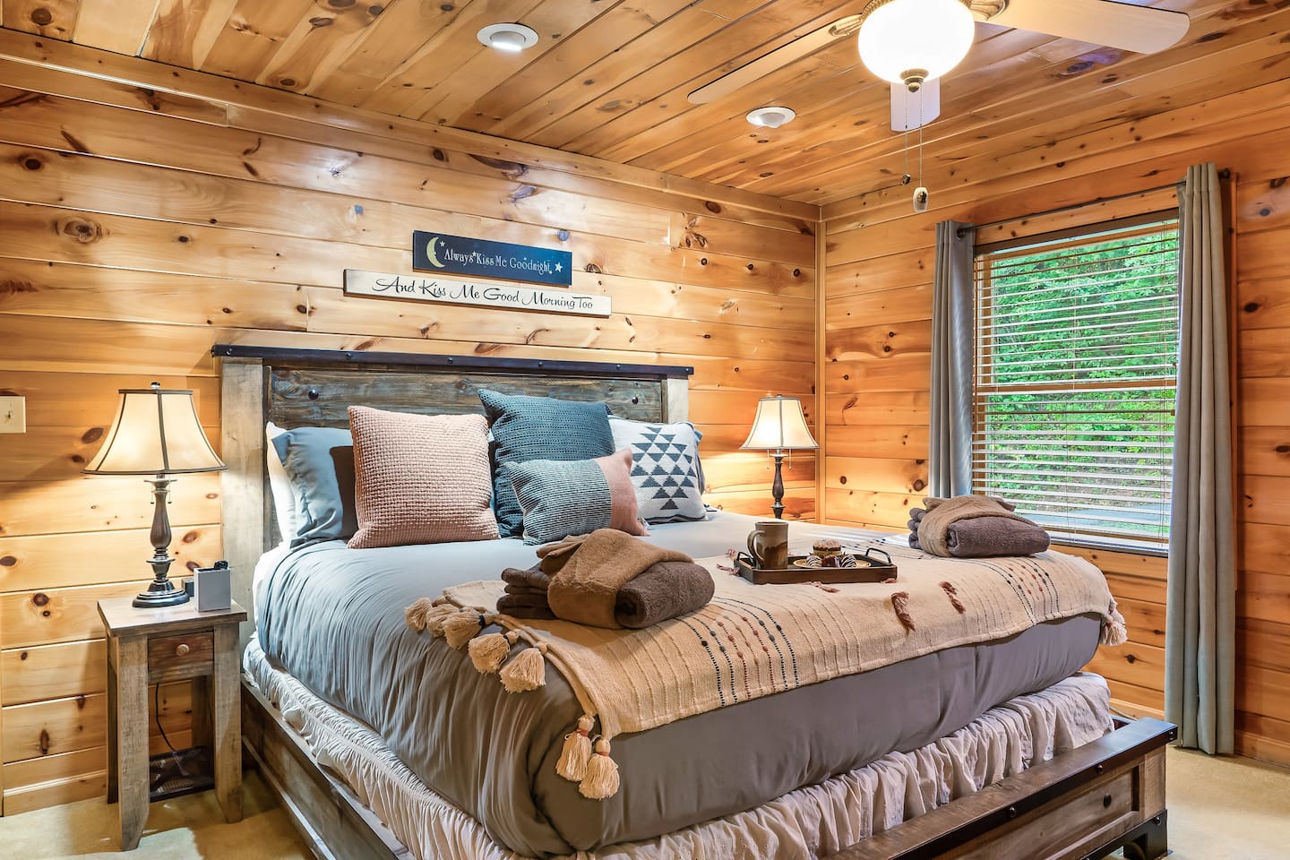 Nestled high among the lush canopy, our cabin offers charm and modern comfort on a gorgeous setting ➤ 4 Bedroom ⎮ 4 Bath ⎮ 2800 ft² ➤ Private hot tub w/ TV ➤ Indoor/outdoor dining ➤ Outdoor movies! ➤ Videogame arcade ➤ Ping Pong ➤ Foosball ➤ Gorgeous covered deck + 180° forest views ➤ Gas grill ➤ Onsite 4 vehicle parking ➤ Gated/guarded community ➤ Onsite washer + dryer ➤ Nearby trails, seasonal pool, sport courts, playground, disc golf, putting green, +more 🚙 15min to the Parkway