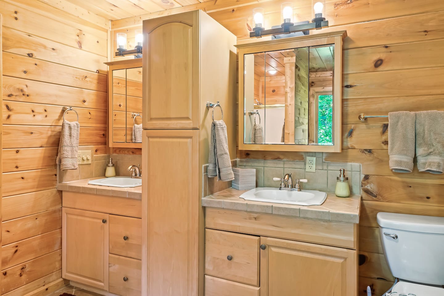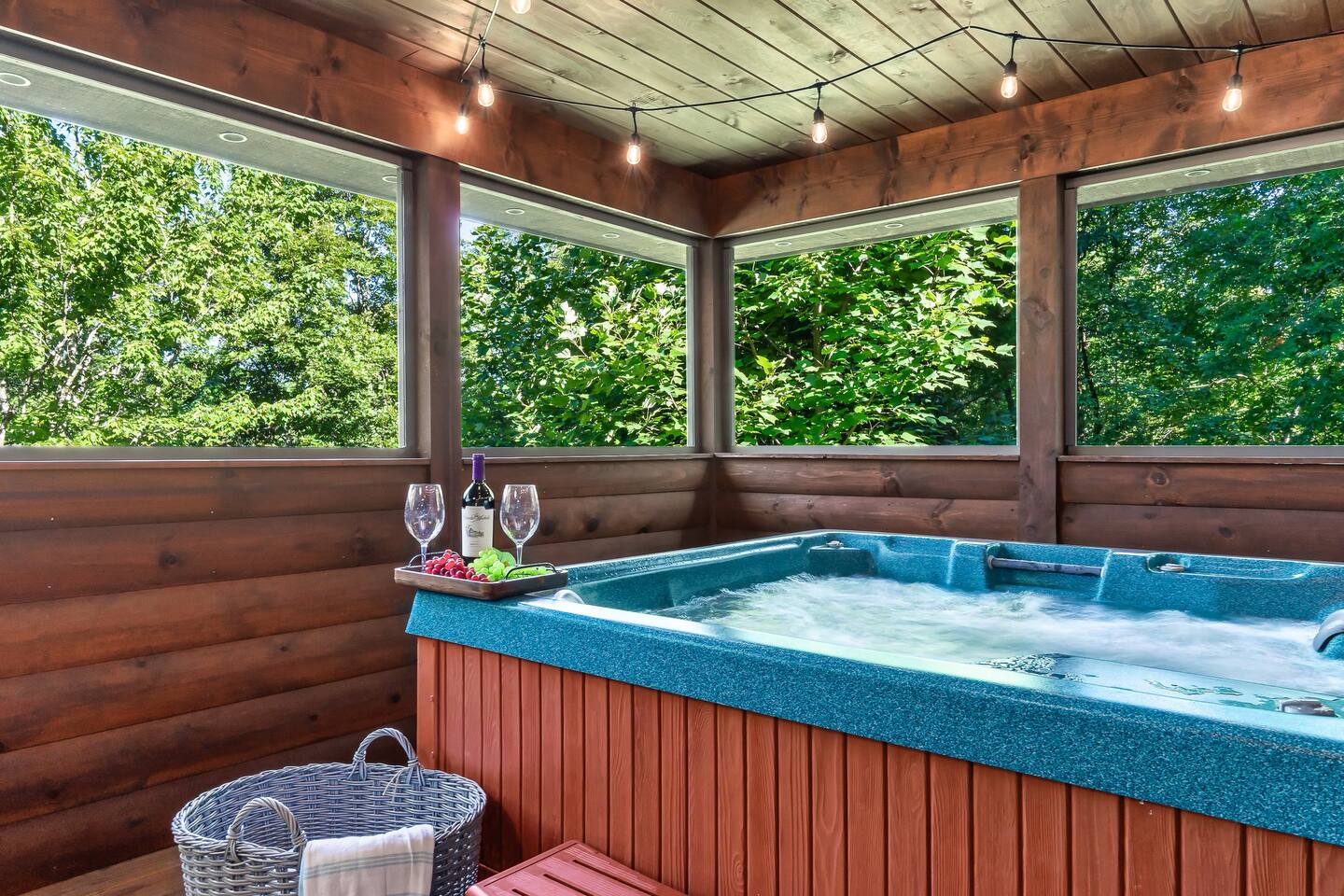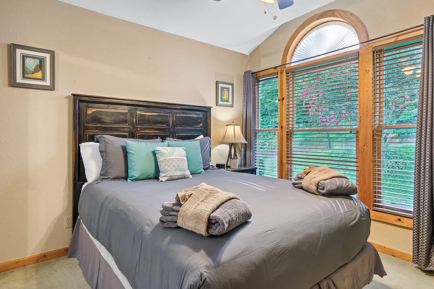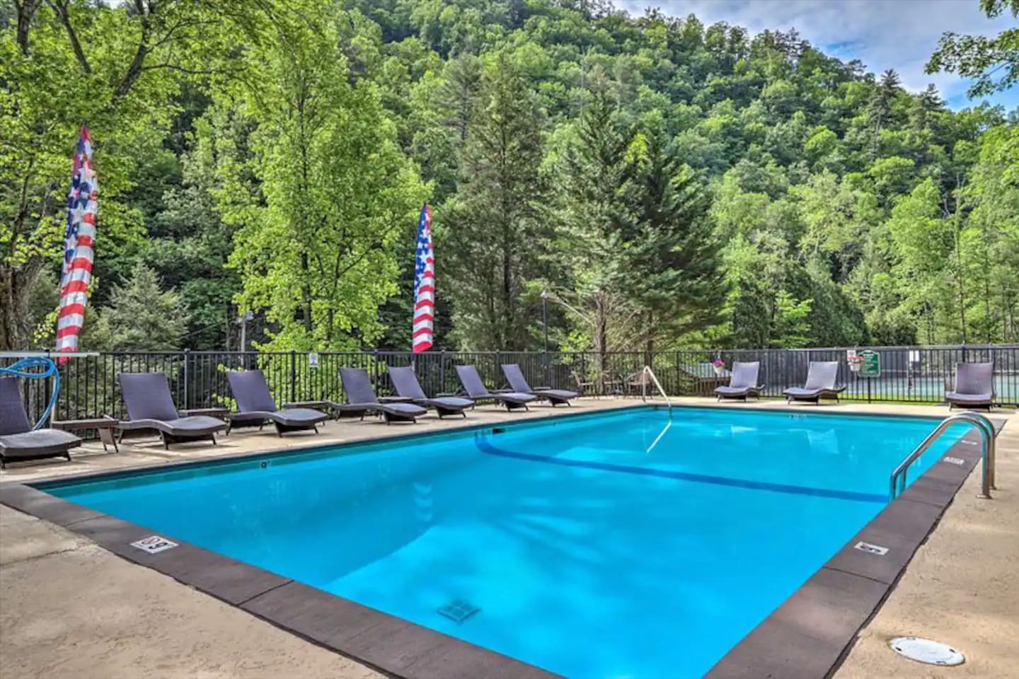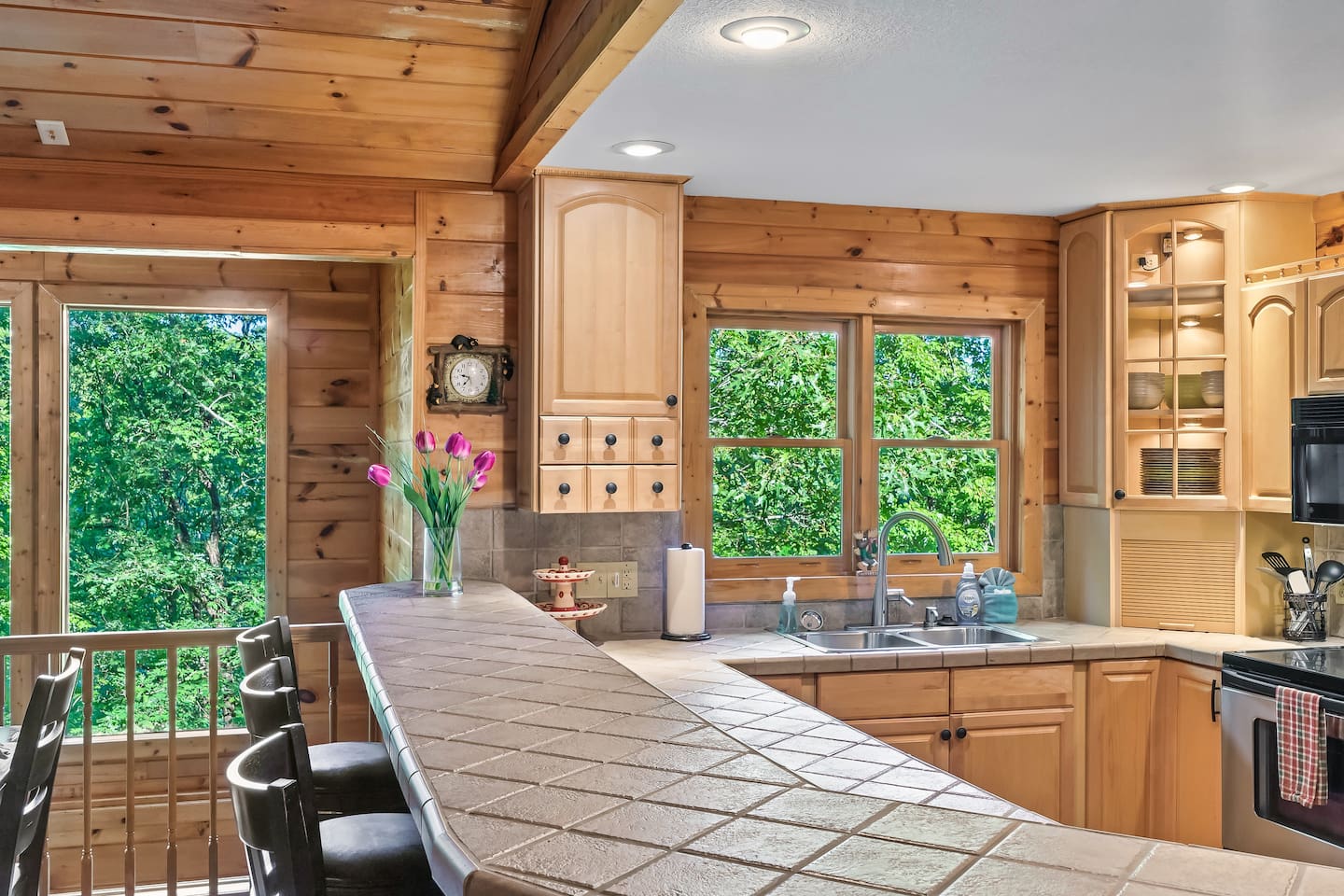 Nestled high among the lush canopy, our cabin offers charm and modern comfort on a gorgeous setting ➤ 4 Bedroom ⎮ 4 Bath ⎮ 2800 ft² ➤ Private hot tub w/ TV ➤ Indoor/outdoor dining ➤ Outdoor movies! ➤ Videogame arcade ➤ Ping Pong ➤ Foosball ➤ Gorgeous covered deck + 180° forest views ➤ Gas grill ➤ Onsite 4 vehicle parking ➤ Gated/guarded community ➤ Onsite washer + dryer ➤ Nearby trails, seasonal pool, sport courts, playground, disc golf, putting green, +more 🚙 15min to the Parkway