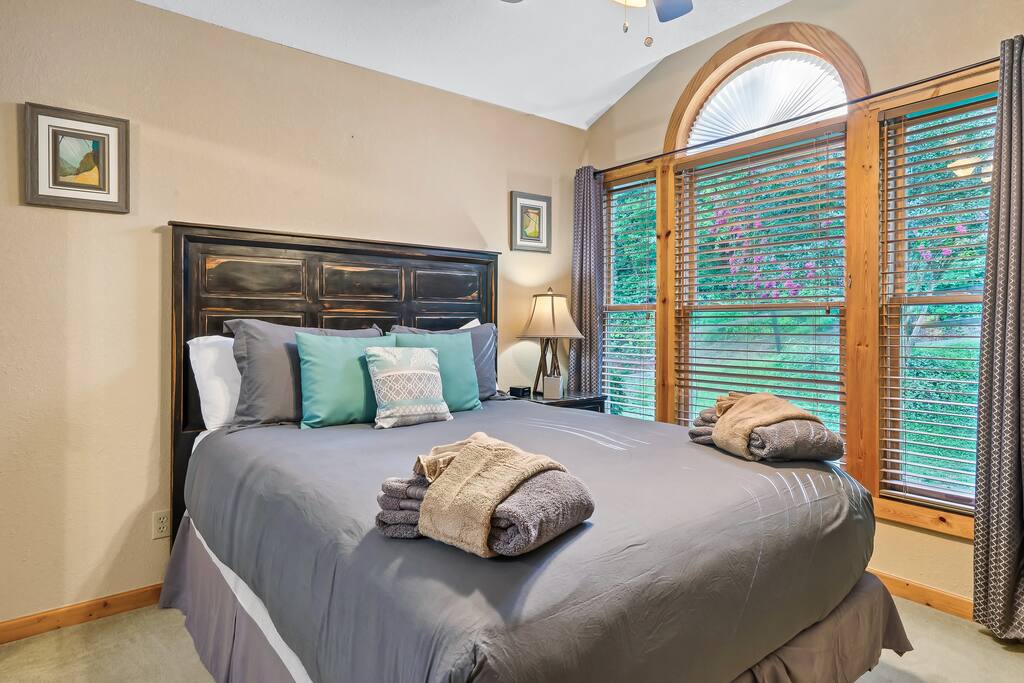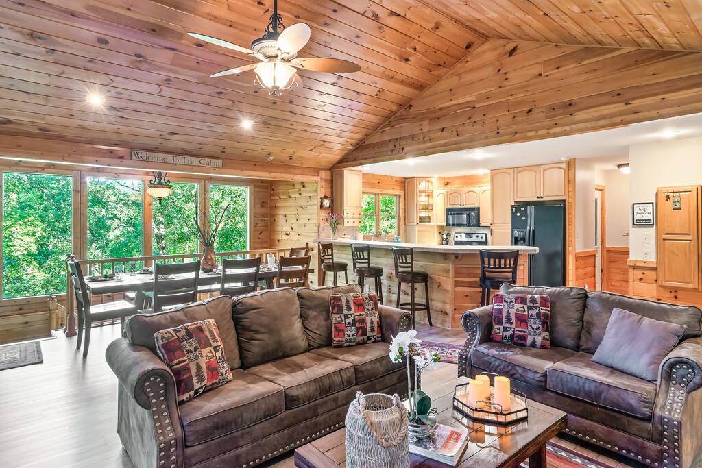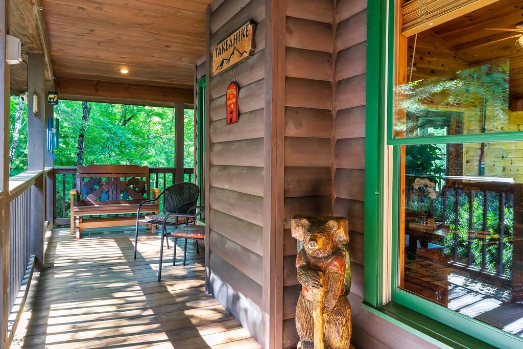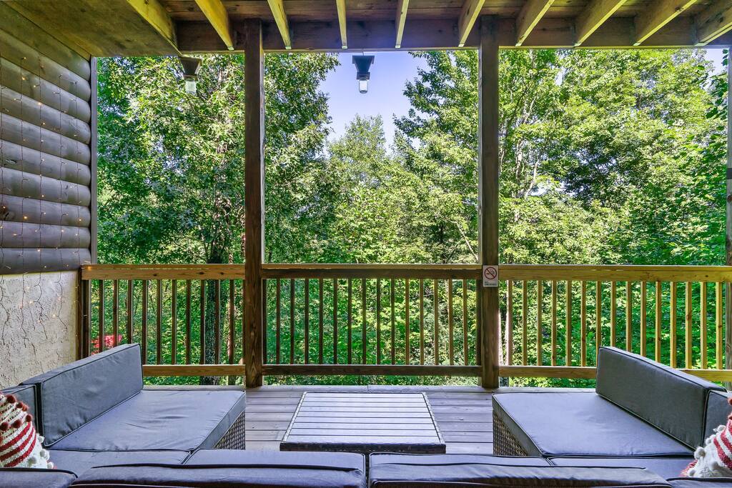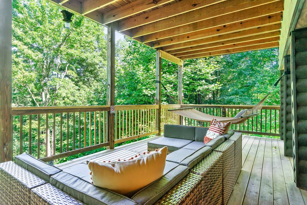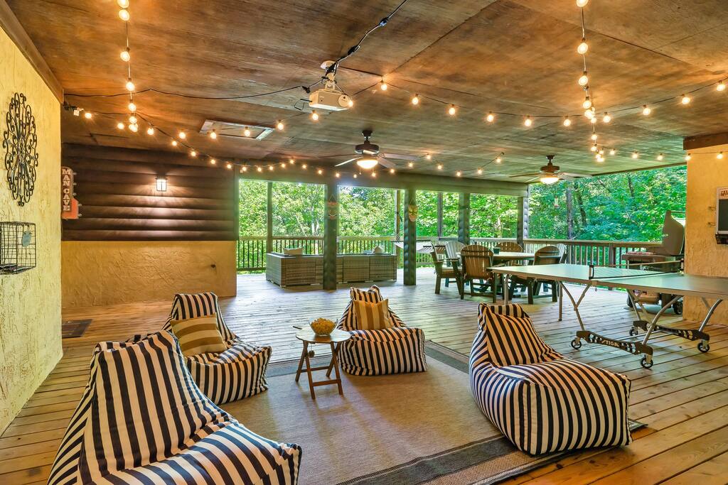 Nestled high among the lush canopy, our cabin offers charm and modern comfort on a gorgeous setting ➤ 4 Bedroom ⎮ 4 Bath ⎮ 2800 ft² ➤ Private hot tub w/ TV ➤ Indoor/outdoor dining ➤ Outdoor movies! ➤ Videogame arcade ➤ Ping Pong ➤ Foosball ➤ Gorgeous covered deck + 180° forest views ➤ Gas grill ➤ Onsite 4 vehicle parking ➤ Gated/guarded community ➤ Onsite washer + dryer ➤ Nearby trails, seasonal pool, sport courts, playground, disc golf, putting green, +more 🚙 15min to the Parkway