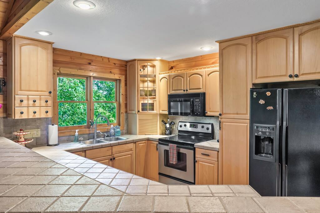 Beautiful spacious lodge, with the privacy you want in a mountain retreat. Home is on three levels, with two bedrooms on main. Main level also has a screened in deck with a private hot tub and lounging area. Second level boasts a large game room with a video game arcade and a foosball table, full bathroom, and the most gorgeous covered deck we've seen in the area. Plenty of room for relaxing, playing games or bear watching. Third level is a 2 bedroom and bath. Layout is perfect for privacy and room to spread out. Gourmet kitchen with wall of windows letting nature into the room! Room for up to 4 cars to park on level drive in front of house.